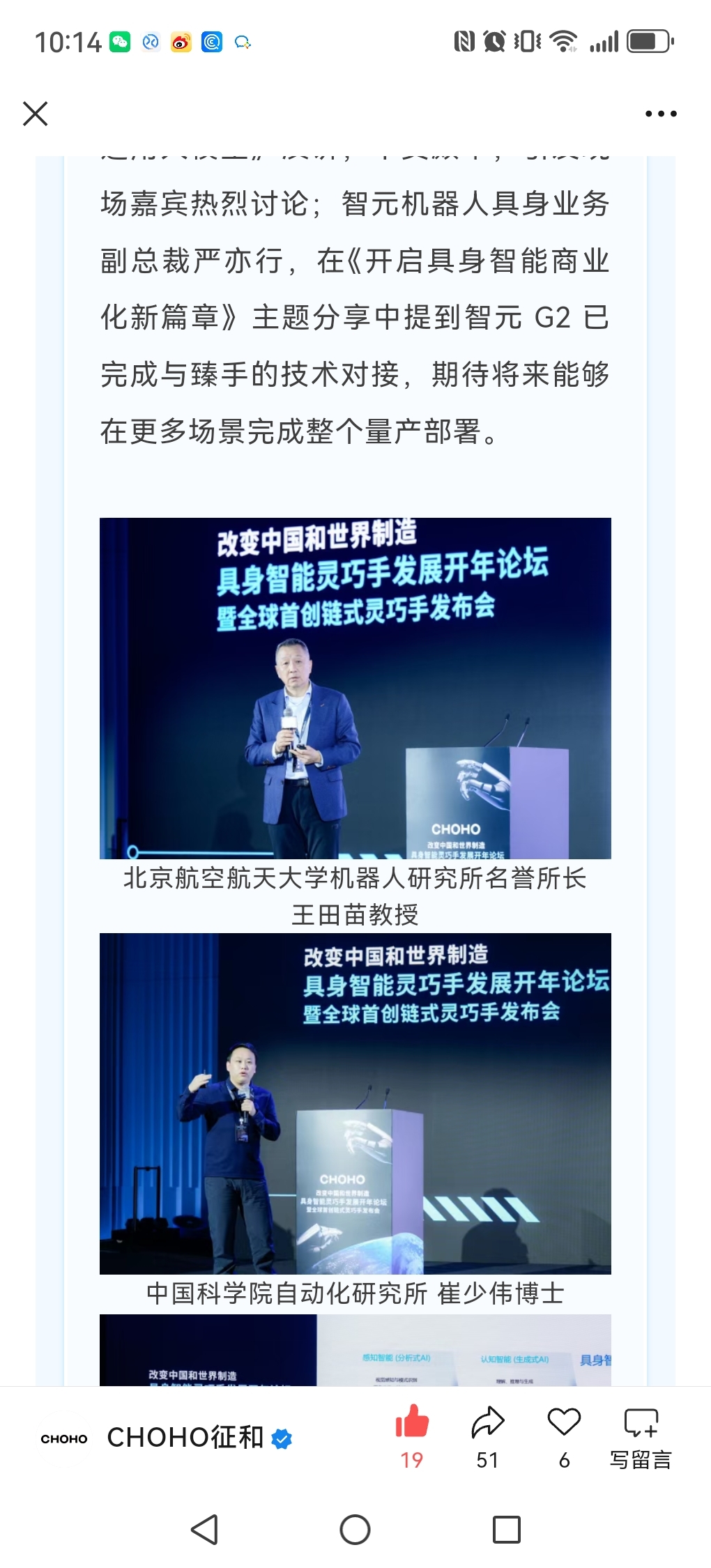 $征和工业(SZ003033)$ 智元机器人具身业务副总裁严亦行,在《开启具身智能商业化新篇章》主题分享中提到智元 G2 已完成与臻手的技术对接,期待将来能够在更多场景完成整个量产部署。