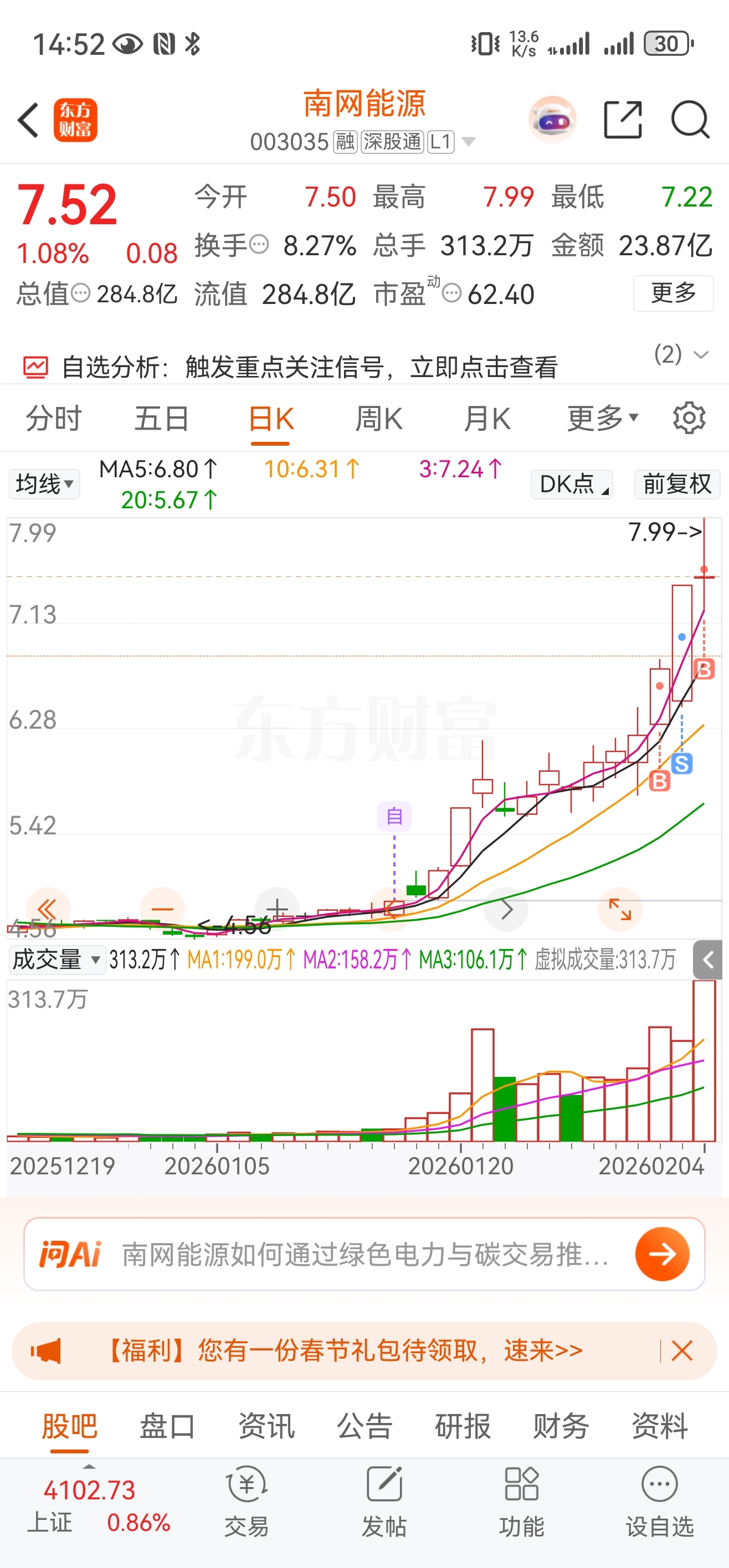 $南网能源(SZ003035)$ 观察了半个月了,好票就是要浮盈加仓