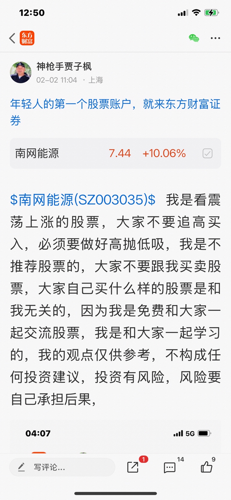 $南网能源(SZ003035)$ 这个股我是二月二号发表文章看涨的好股票,我是不推荐股票的,大家不要跟我买卖股票,大家自己买什么样的股票是和我无关的,因为我是免费和大家一起交流股票,我是和大家一起学习的,我的观点仅供参考,投资有风险,风险要自己承担后果,