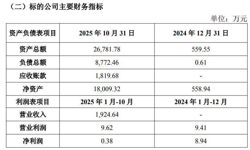 标的公司最近财务数据方面,数据显示(见下表),截至2025年10月31日,其资产总额为2.68亿元,负债总额为8772万元,净资产为1.8亿元。2025年1月-10月,公司营业收入为1925万元,净利润为3800元,经营活动现金流-950万元。