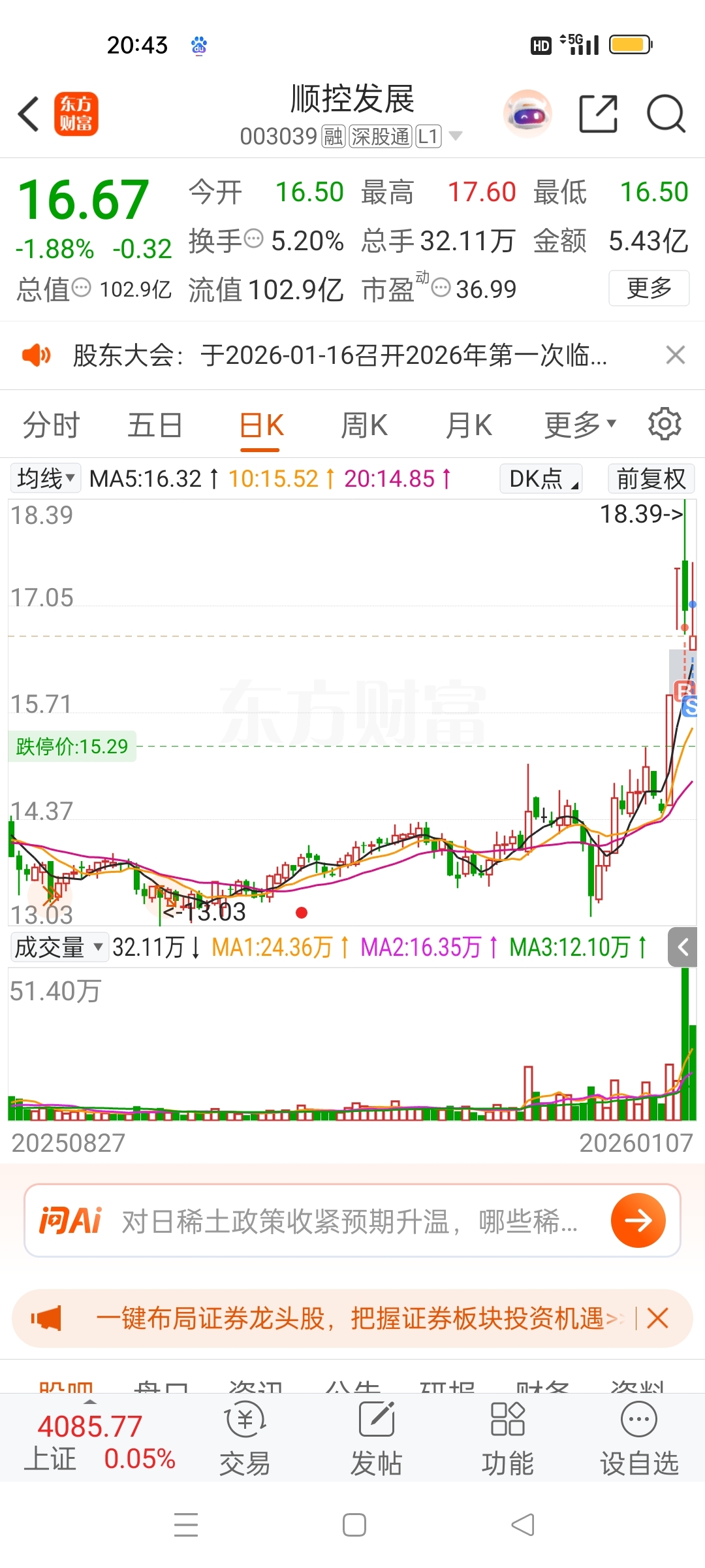 $顺控发展(SZ003039)$ 挣一点点跑路,今买明卖,套不住人。没法卖在最高点。
