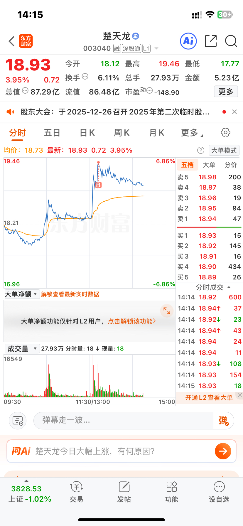 $楚天龙(SZ003040)$ 今天亏了不少,想着追个上涨的回点血