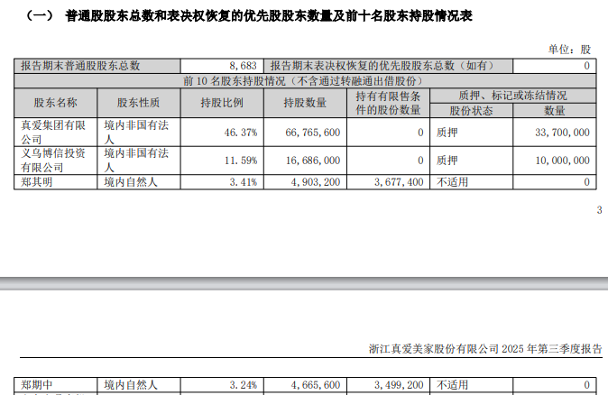 截至2025年第三季度末,真爱集团直接持有真爱美家6676.56万股股份,持股比例达46.37%;其中质押股份数量为3370万股,占真爱集团所持真爱美家股份的比例为50.48%。