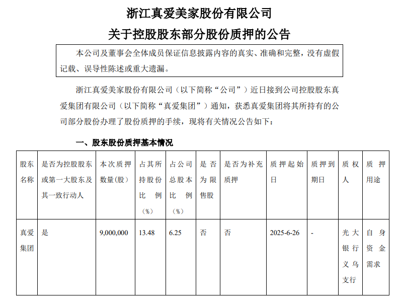 比如,真爱美家6月28日公告称,真爱集团将其所持公司部分股份办理了质押手续,用途为自身资金需求,未来还款资金来源为真爱集团自有或自筹资金。