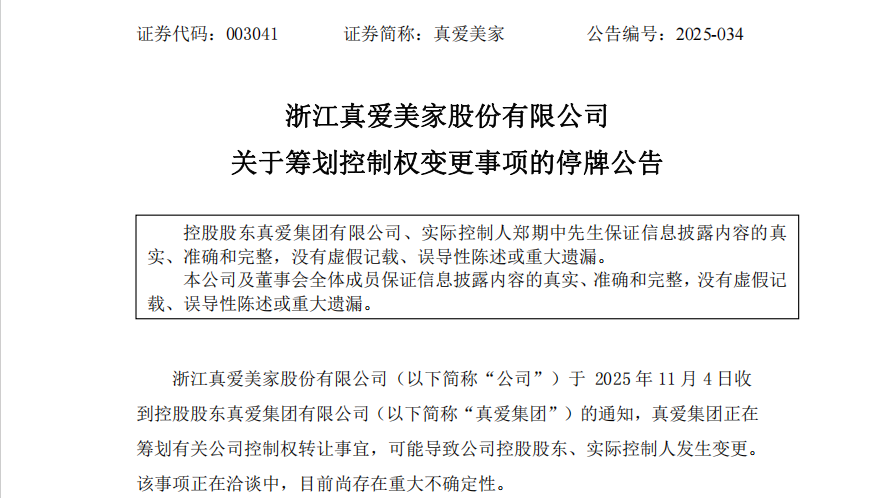 11月4日,真爱美家收到真爱集团的通知称,真爱集团正在筹划有关真爱美家的控制权转让事宜。
