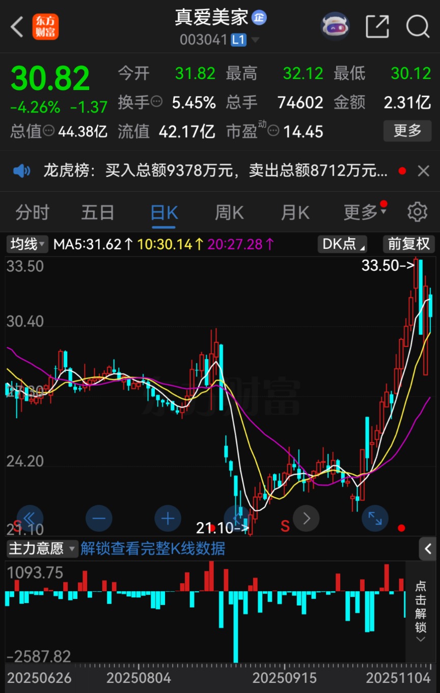 真爱美家计划自11月5日开市起停牌,预计停牌时间不超过2个交易日。截至11月4日收盘,真爱美家股价报30.82元/股,总市值为44.38亿元。