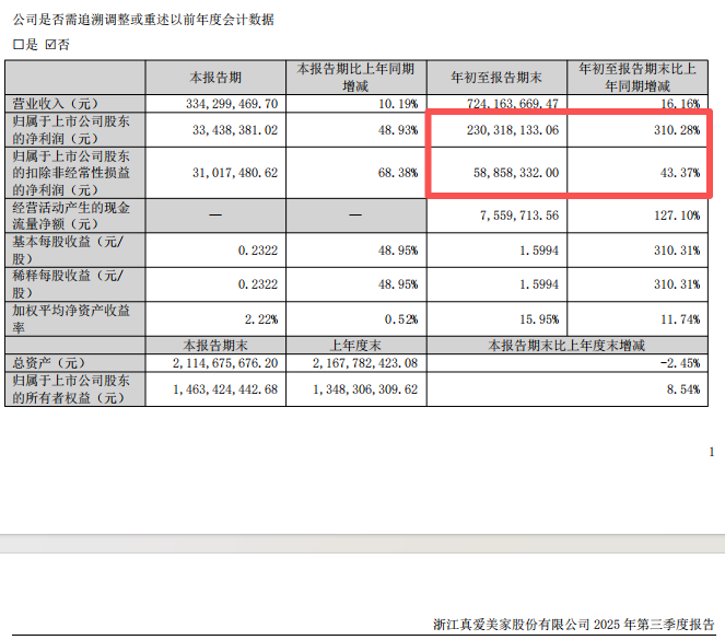 2025年前三季度,真爱美家的归母净利润同比增长310.28%至2.30亿元,扣非后净利润同比增长43.37%至5885.83万元。