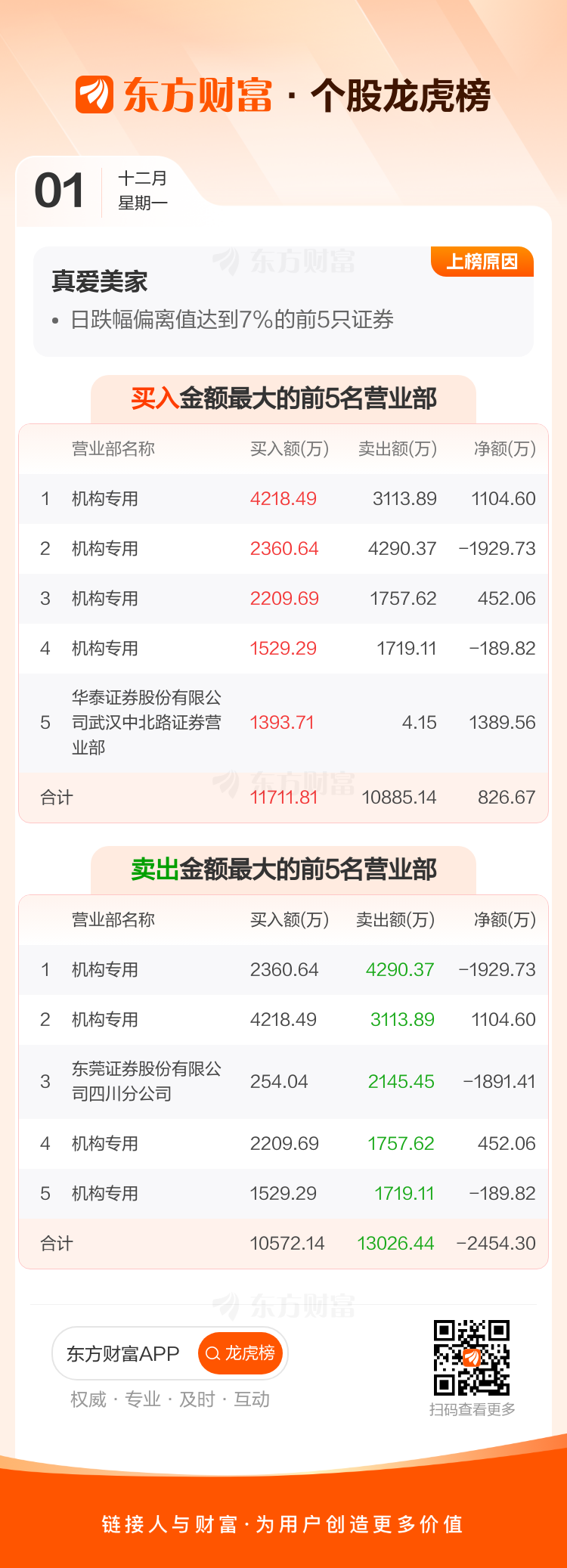交易所2025年12月1日公布的交易公开信息显示,真爱美家因成为日跌幅偏离值达到7%的前5只证券上榜。真爱美家当日收报49.47元,涨跌幅-8.05%,偏离值-9.07%,换手率11.69%,成交额8.25亿。