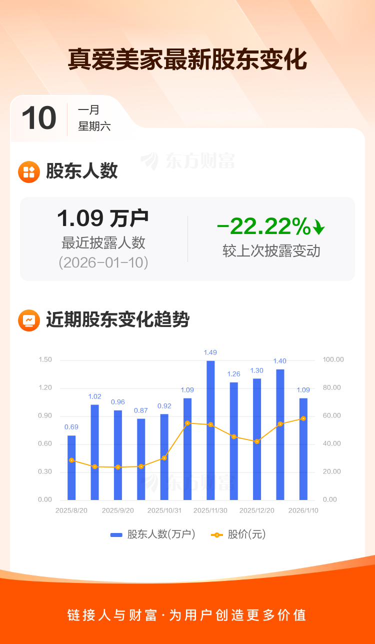 真爱美家:截至1月10日最新股东户数1.09万户,较上期减少22.22%