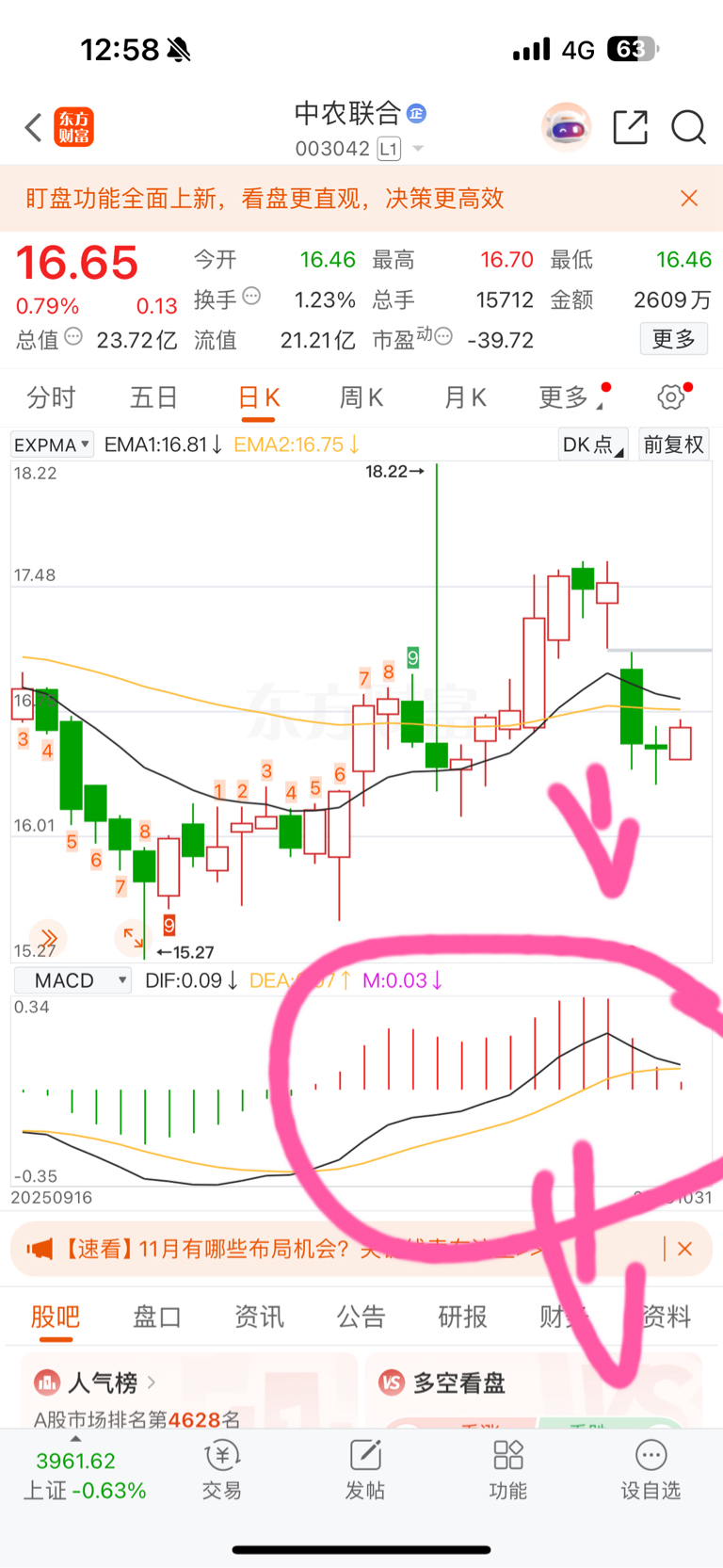 $中农联合(SZ003042)$  日线macd即将死叉,也就是说今天是一个止损点。下周回来会继续下探。