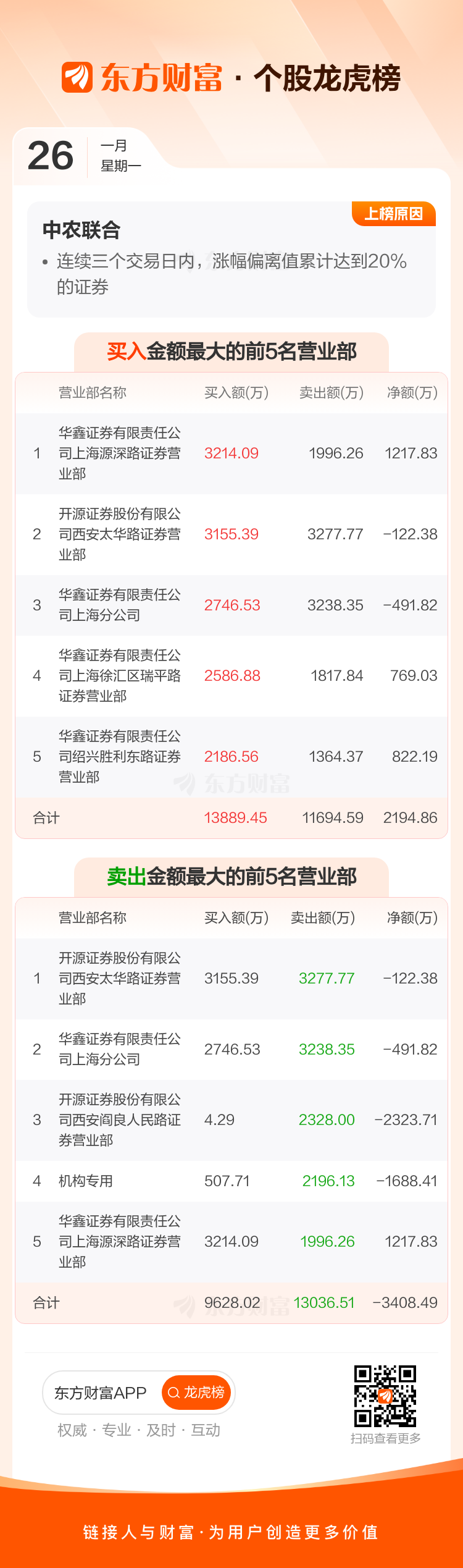 交易所2026年1月26日公布的交易公开信息显示,中农联合因成为连续三个交易日内,涨幅偏离值累计达到20%的证券上榜。中农联合当日收报21元,涨跌幅10.01%,换手率21.42%,成交额5.65亿。异常期间1月23日至1月26日,期间涨幅21.04%,累计偏离值20.77%,区间成交额8.40亿。