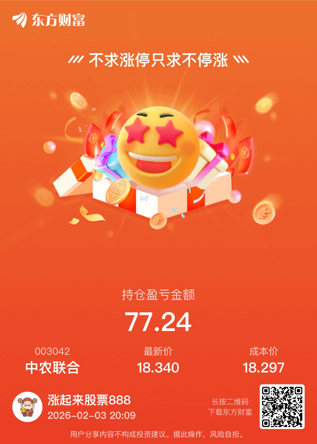 $中农联合(SZ003042)$ 可惜今天没满仓,明天加满