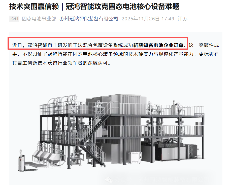 华亚智能子公司冠鸿固态设备打入头部电池厂商,与海外知名车企完成带料测试与送样生产