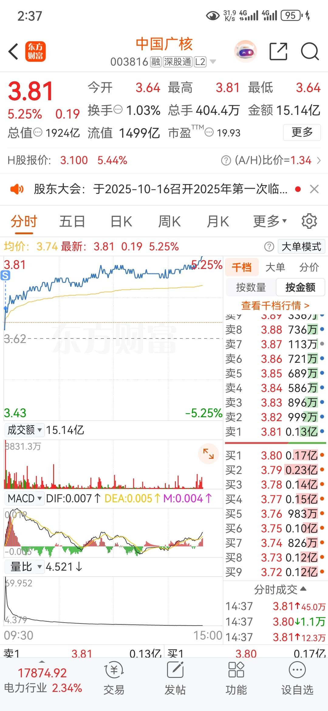 $中国广核(SZ003816)$ 你今天是要闹哪样快下来3.59我买回来