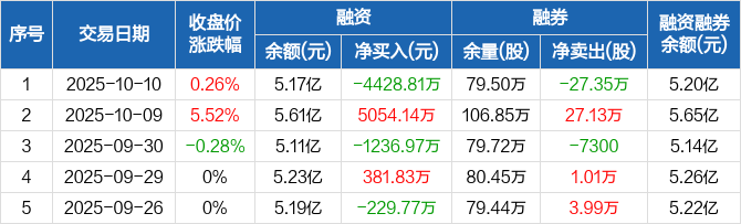 融资方面,当日融资买入1.09亿元,融资偿还1.53亿元,融资净偿还4428.81万元。融券方面,融券卖出2900股,融券偿还27.64万股,融券余量79.5万股,融券余额304.49万元。融资融券余额合计5.2亿元。