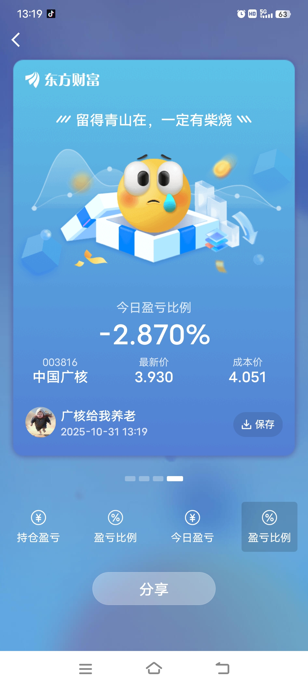 $中国广核(SZ003816)$ 这一波我看到3.8如果止不住的话,估计会回到3.4左右,我买这个票是奔着养老来的,不知道老铁们是准备干啥