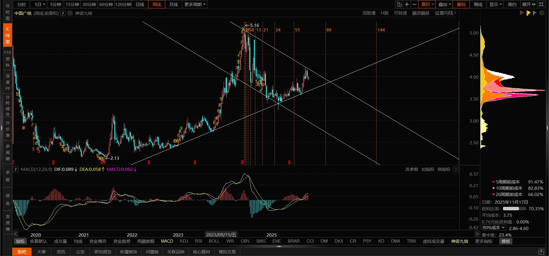 科技方向临近左侧点位支撑(参考21周均线点位-可做左侧试错博弈)因科技跟高股息红利有跷跷板属性(乃此原因判断广核目前为C杀,且空间还不够位,抄底还需些许时间,请诸公耐心等待