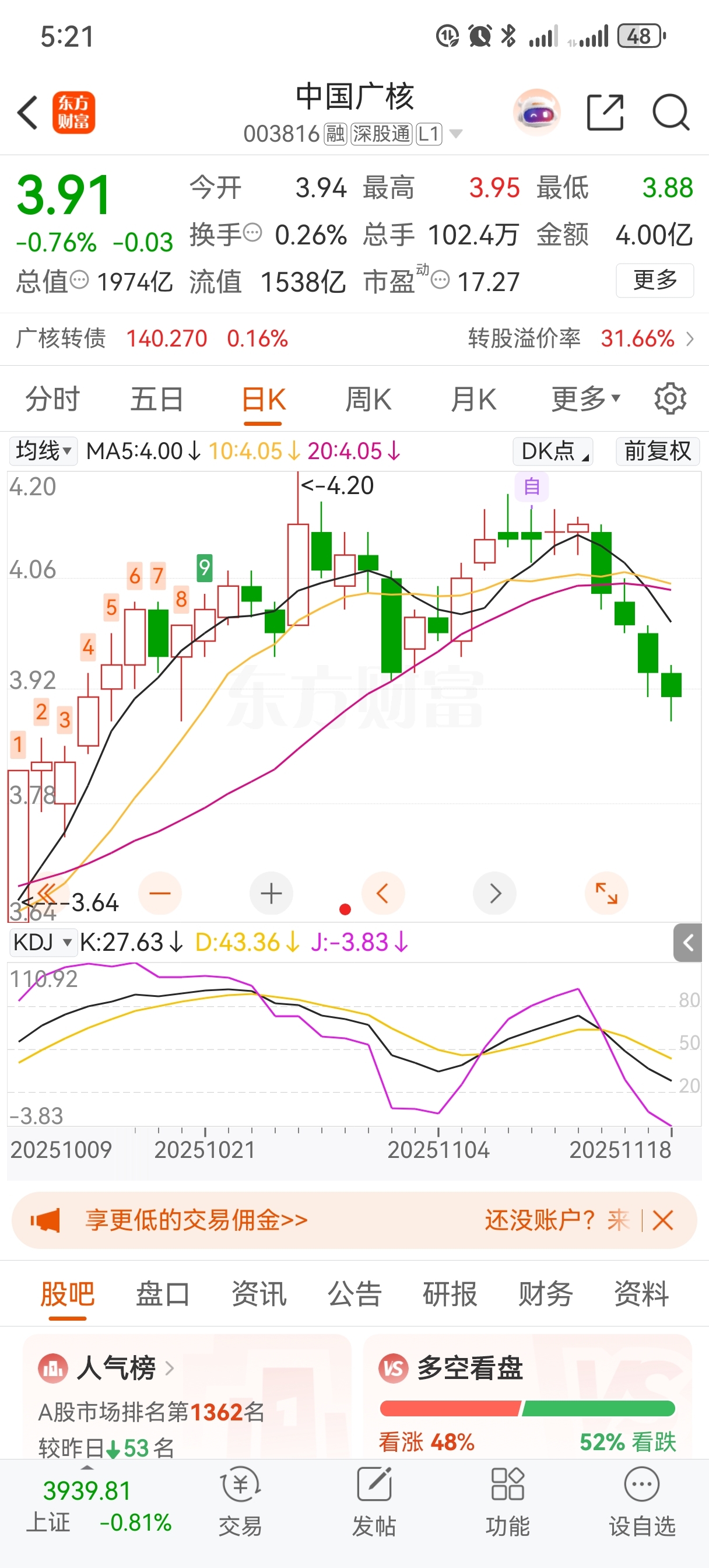 KDJ的J值终于到了负值~~~-3.83;反转在即了