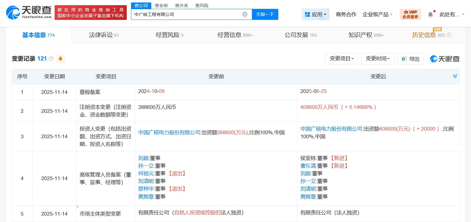 南方财经11月19日电,天眼查工商信息显示,近日,中广核工程有限公司发生工商变更,注册资本由38.86亿人民币增至40.86亿人民币,增幅约5%,同时,多位高管发生变更。该公司成立于1997年11月,法定代表人为宁小平,经营范围含软件和信息技术、工程建设技术、质检技术的服务、咨询,经济信息咨询,经营进出口业务等。股东信息显示,该公司由中国广核(003816)全资持股。