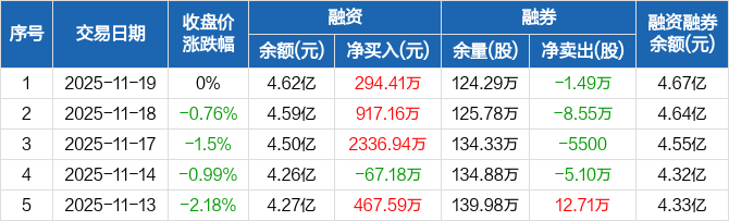 融资方面,当日融资买入3028.65万元,融资偿还2734.24万元,融资净买入294.41万元,连续3日净买入累计3548.5万元。融券方面,融券卖出600股,融券偿还1.55万股,融券余量124.29万股,融券余额485.97万元。融资融券余额合计4.67亿元。