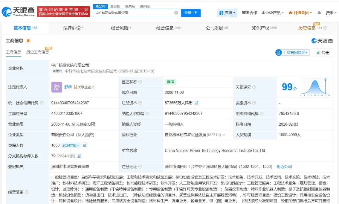 每经AI快讯,天眼查App显示,近日,中广核研究院有限公司发生工商变更,注册资本由约41.4亿元人民币增至约57.4亿元人民币,增幅约39%。该公司成立于2006年11月,法定代表人为舒睿,经营范围包括自然科学研究和试验发展、工程和技术研究和试验发展、核电设备成套及工程技术研发等,由中国广核(003816)全资持股。