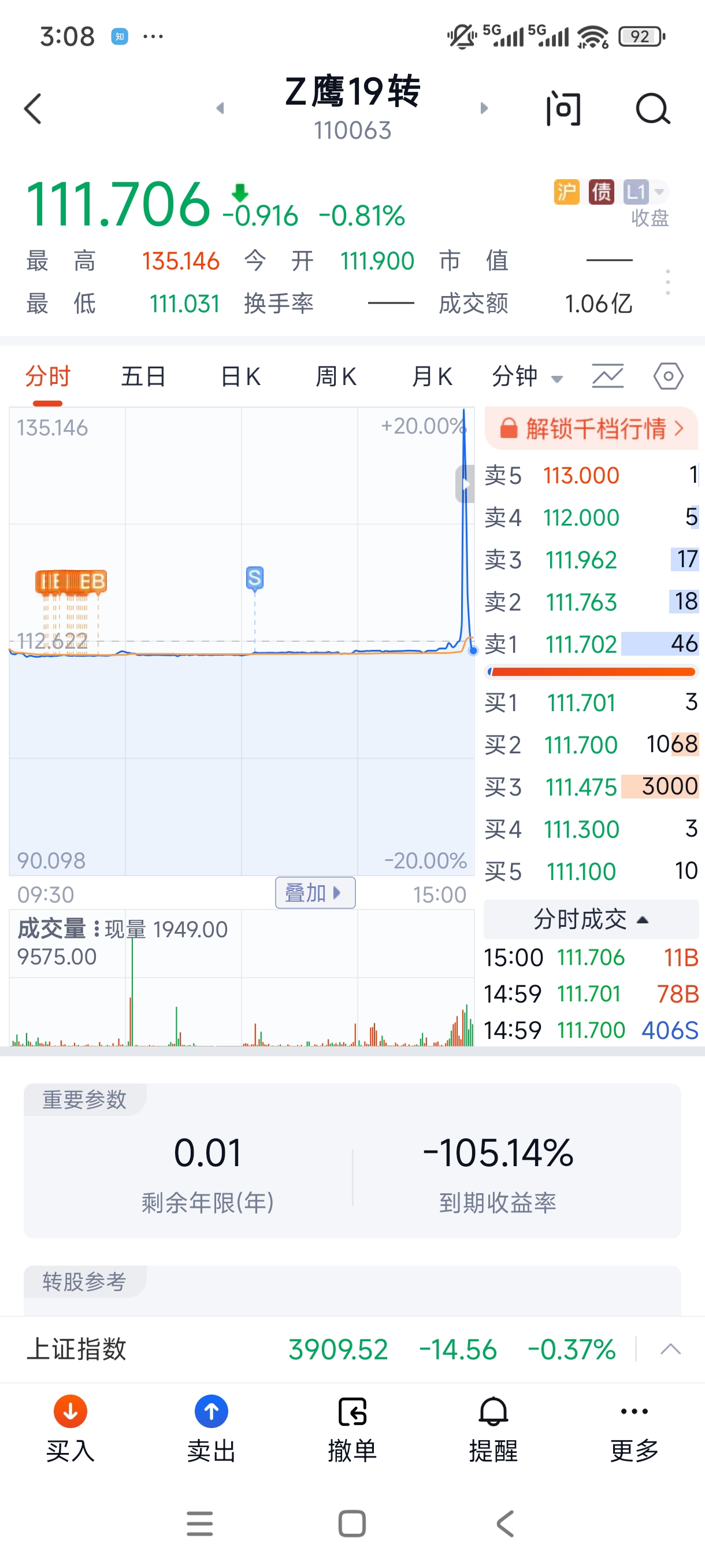 $Z鹰19转(SH110063)$ 111.5卖的 卖的太保守了