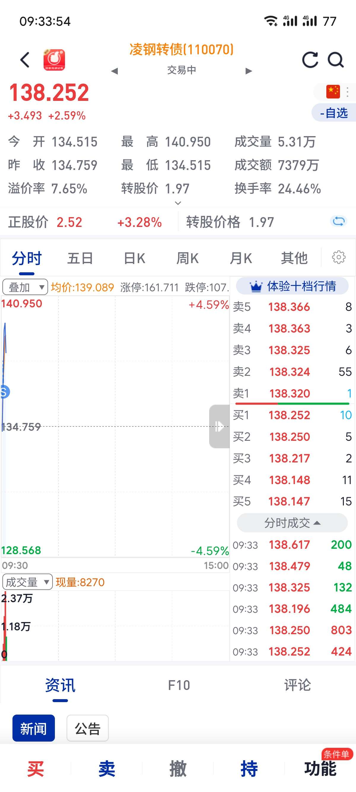 $凌钢转债(SH110070)$ 134.7尾盘买入,搏个冲高。$凌钢股份(SH600231)$