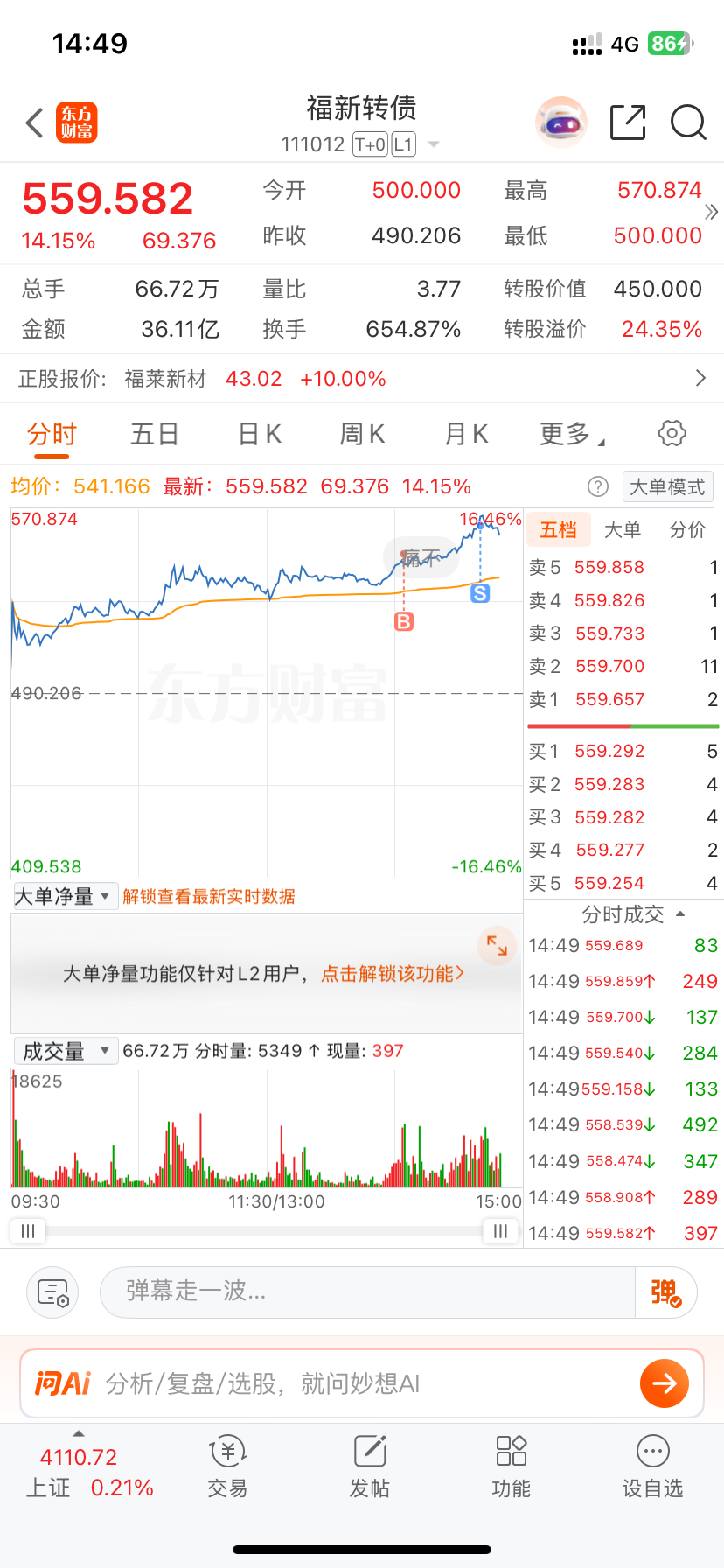 $福新转债(SH111012)$ 感谢主力 本来早上赚1500、进恒帅变亏2000多,这里让我今天回本还赚2000多