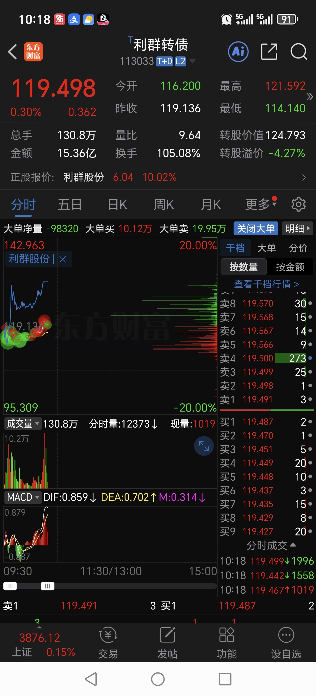 大家把正股叠加到可转债上边,就能发现主力一直在压着吃货,当正股涨停时出现了负百分之四的溢价率,这是非常少有的机会,大家赶紧吃货,别卖货,下午收市前可以转股无风险套利。