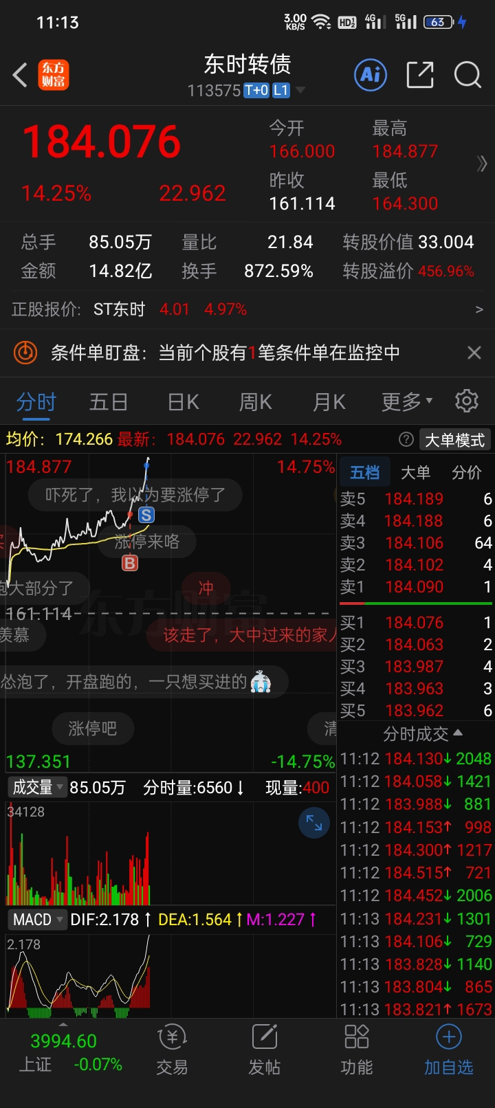 $东时转债(SH113575)$ 前几天160买的,今天加了一次仓,全出了感谢东东