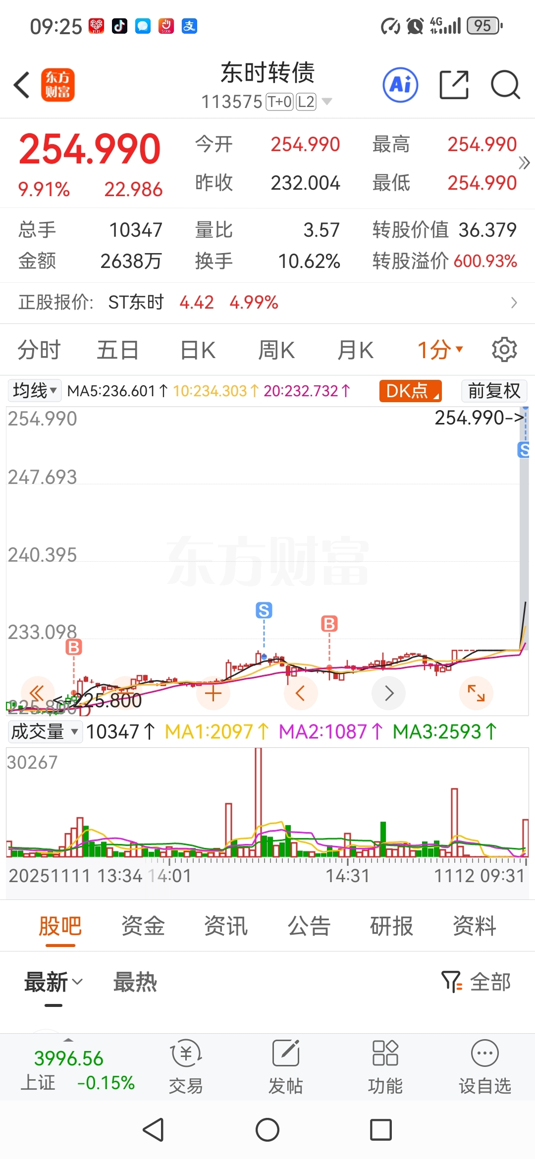 $东时转债(SH113575)$ 开盘价卖出东时,短时间不再参与东时,风险太大,完全看主力心情了。祝留下的发财