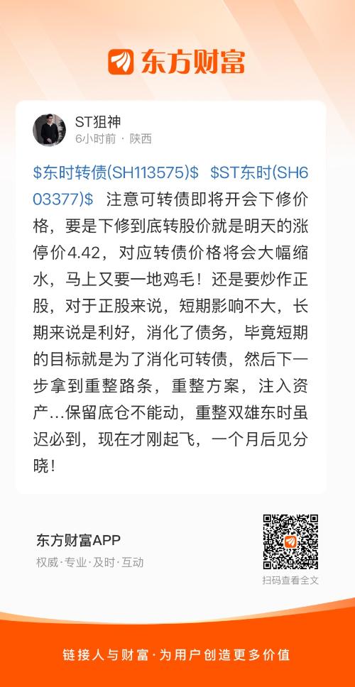 $东时转债(SH113575)$ $ST东时(SH603377)$ 注意可转债即将开会下修价格,要是下修到底转股价就是明天的涨停价4.42,对应转债价格将会大幅缩水,马上又要一地鸡毛!还是要炒作正股,对于正股来说,短期影响不大,长期来说是利好,消化了债务,毕竟短期的目标就是为了消化可转债,然后下一步拿到重整路条,重整方案,注入资产…保留底仓不能动,重整双雄东时虽迟必到,现在才刚起飞,一个月后见分晓!