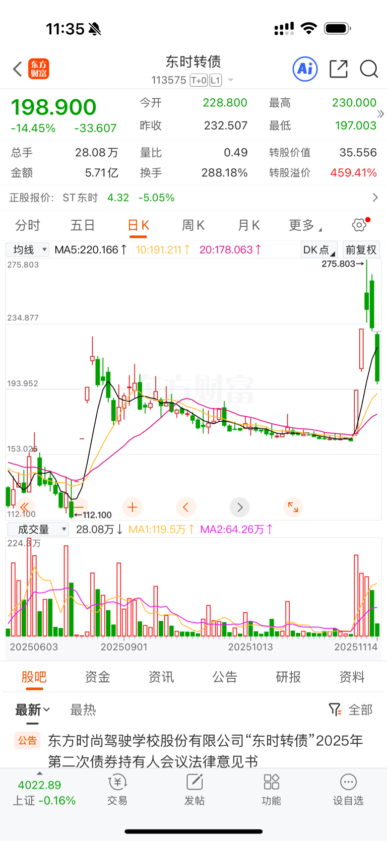 $东时转债(SH113575)$ 225的成本,有种跌停?