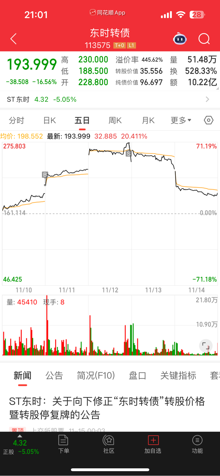 $东时转债(SH113575)$ 可转债就是这样,高收益高风险,东时下一波反弹估计要等月底