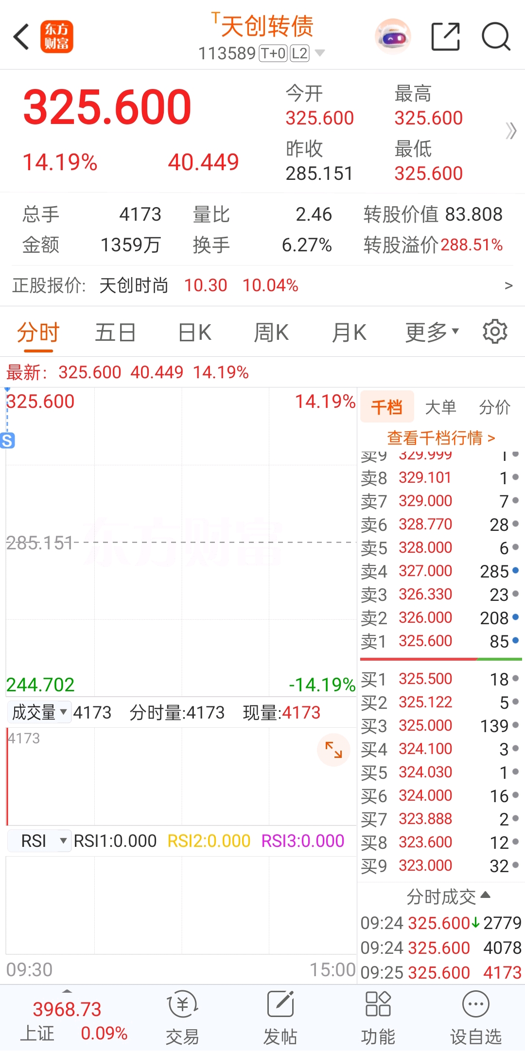 $天创转债(SH113589)$ 很不错,过300了,天创依然猛!卖完了,剩下你们赚!