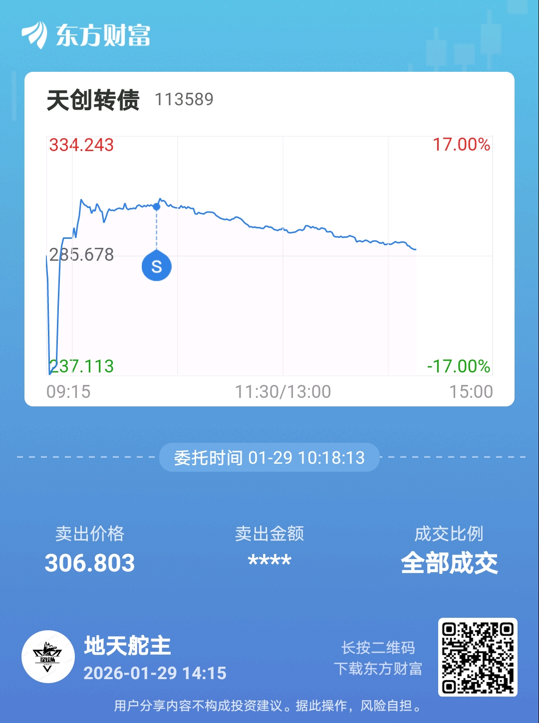 温馨提示: 1.根据《证券法》规定,禁止编造、传播虚假信息或者误导性信息,扰乱证券市场;2.用户在本社区发表的所有资料、言论等仅代表个人观点,与本网站立场无关,不对您构成任何投资建议。用户应基于自己的独立判断,自行决定证券投资并承担相应风险。《东方财富社区管理规定》
