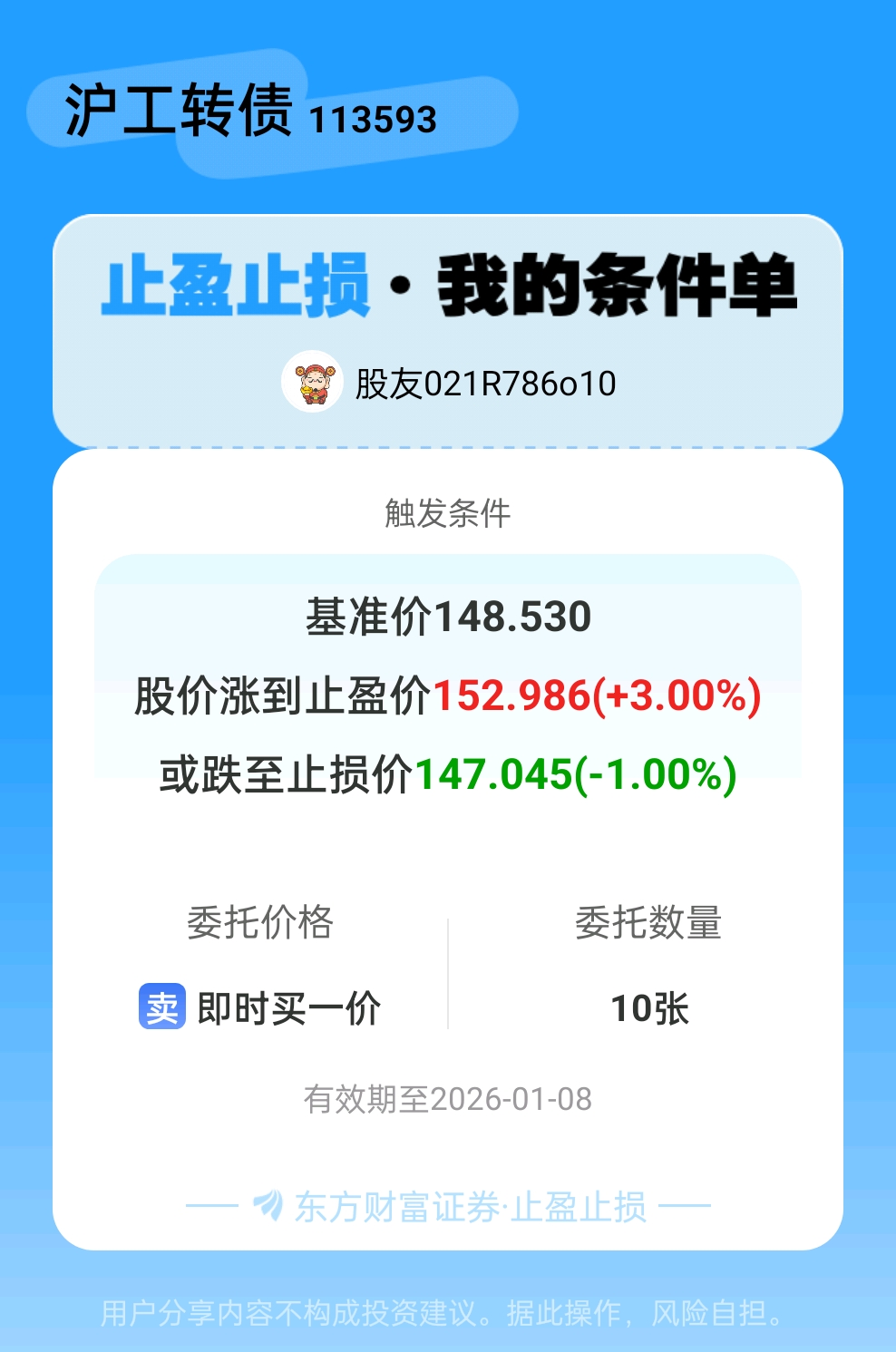#条件单交流# #止盈止损晒单# 一位股神设置了一个止盈止损条件单,接下来就是见证奇迹的时刻~$沪工转债(SH113593)$