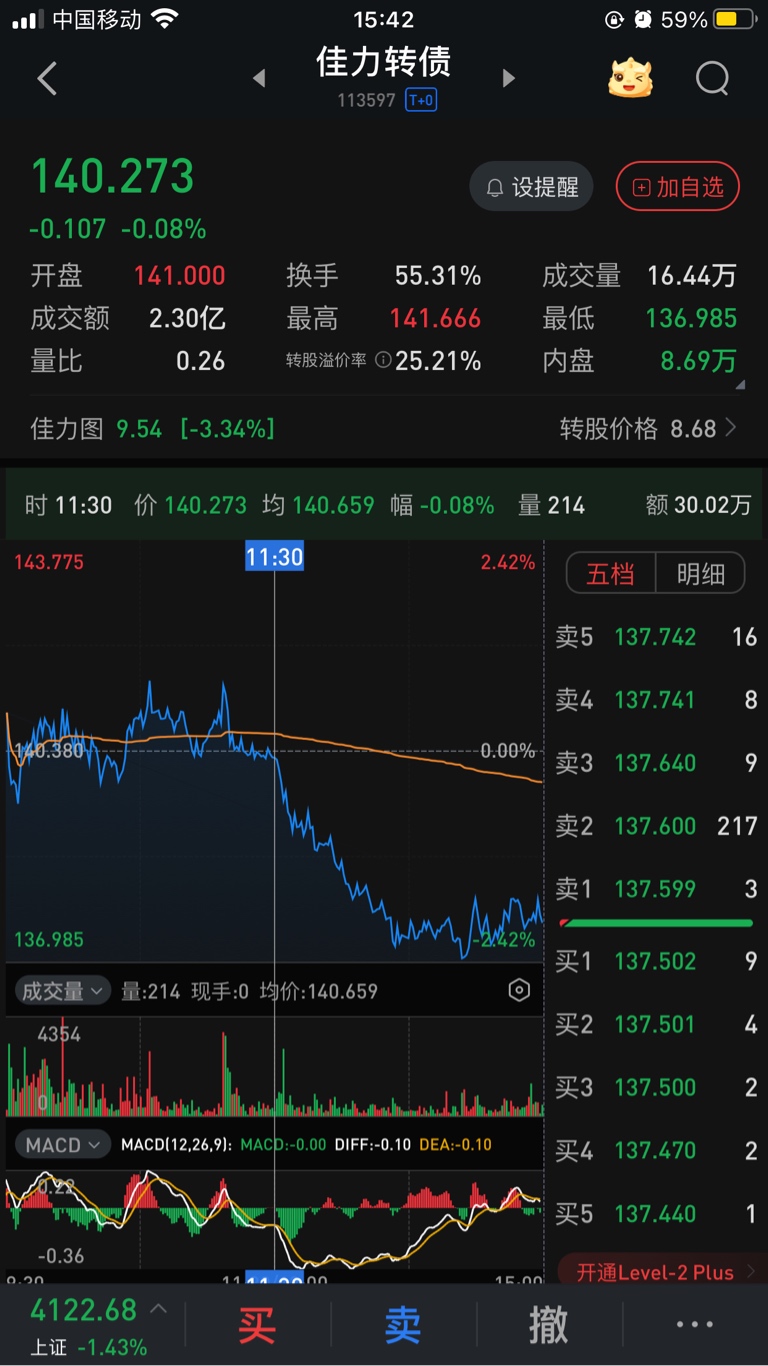 小吃一个点,下午大盘狂跳水,拖累了,多注意市场风向,不然为什么狂跳水都不知道。下午市场成恐慌了,4800多止跌,跌停83只。总共才5000多只跌,跌4800,SJ。下一支撑位136.6,没走的,下面没多大下跌空间,等反弹高走。