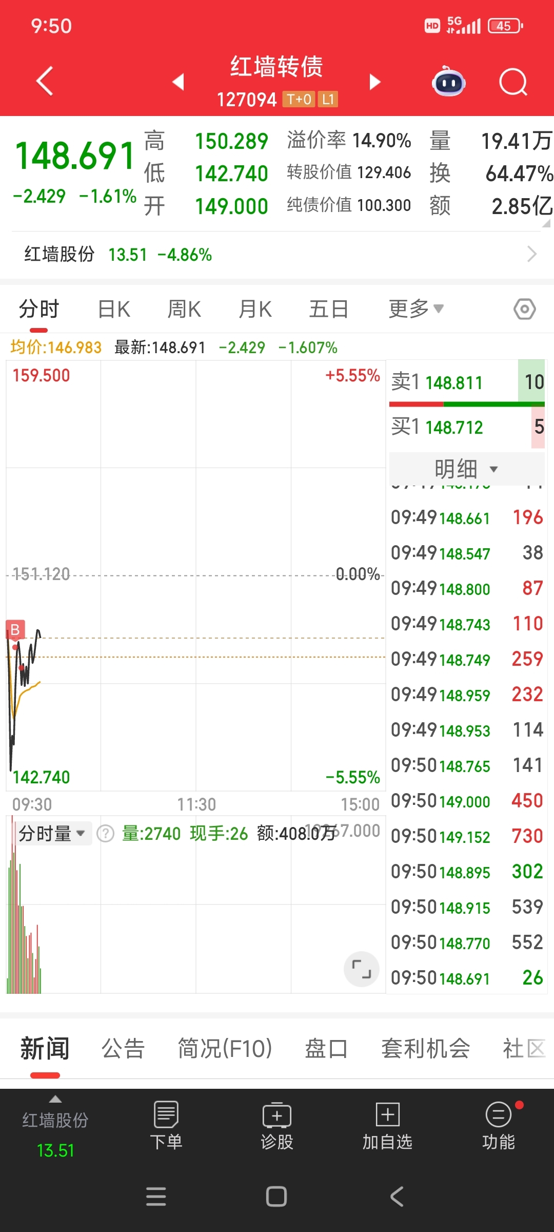 这种行情客观交易策略上应该是空仓!早盘天准都放弃了选择了红墙!结合盘面,以防守为主!!早盘正股率先完成了大幅下跌!如果判定为暴力洗盘!即使叠加大盘大跌至少今天红墙是安全的!满仓再说!