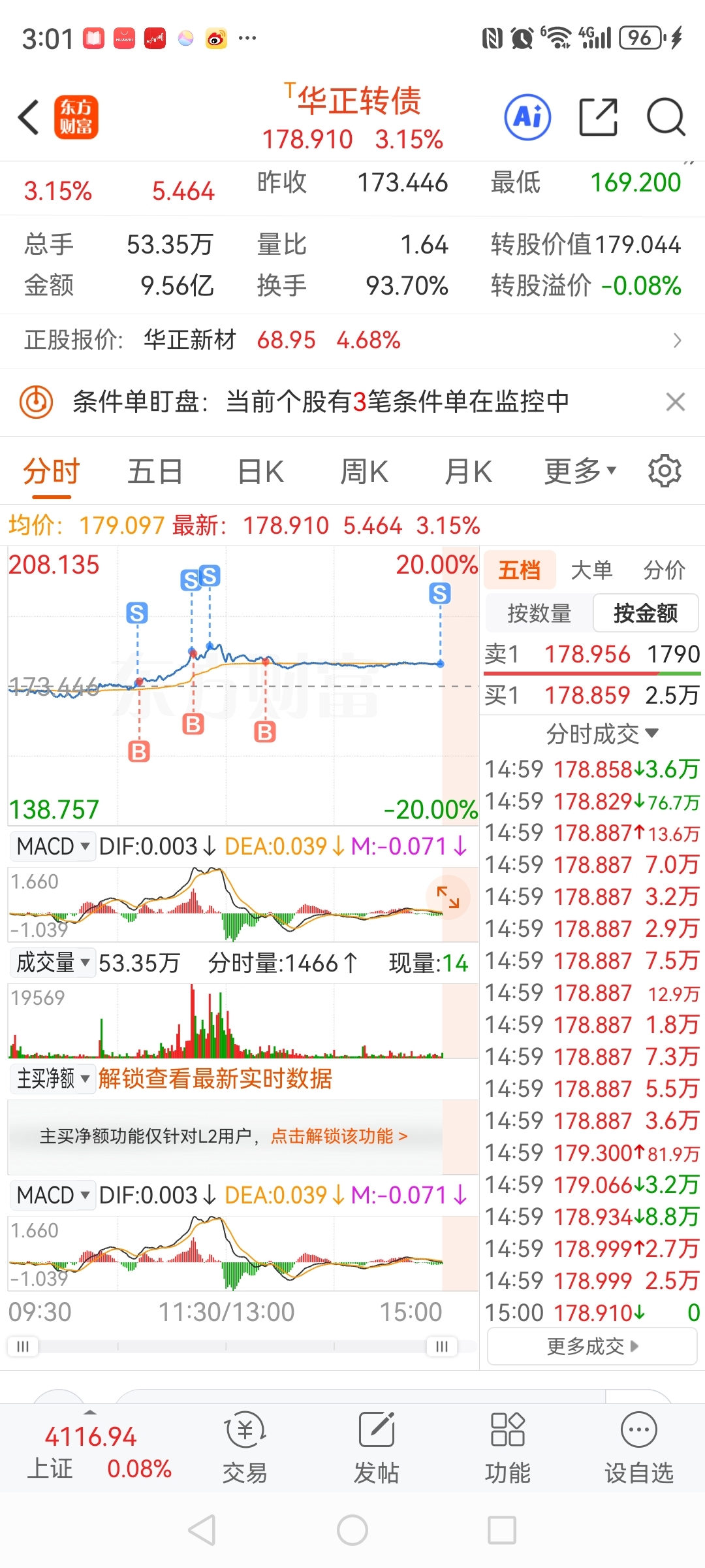 $华正转债(SH113639)$ 下午交易机会不理想,明天再来看吧