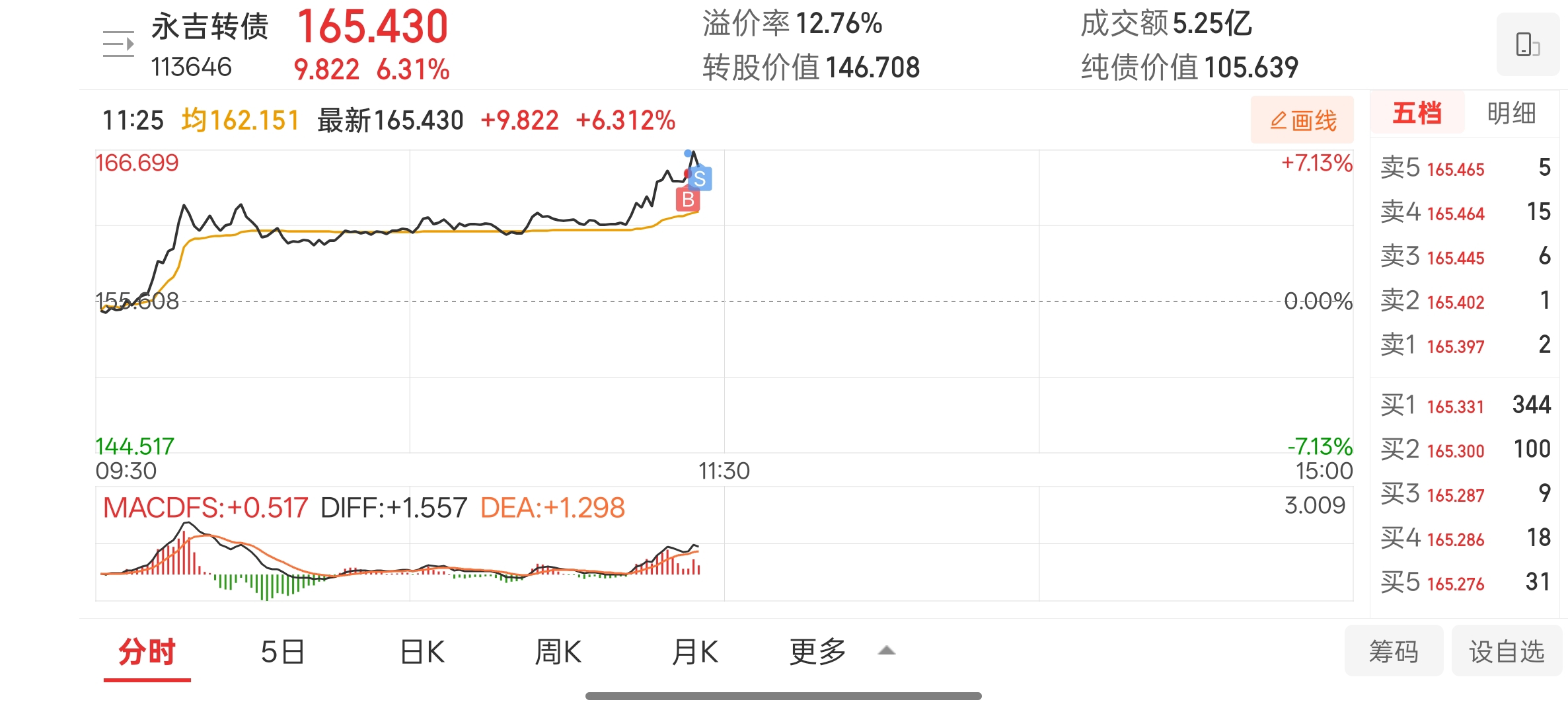 $永吉转债(SH113646)$ 刚看到我正股涨停,可转债压力位165.450,所以低吸套利做T喝汤