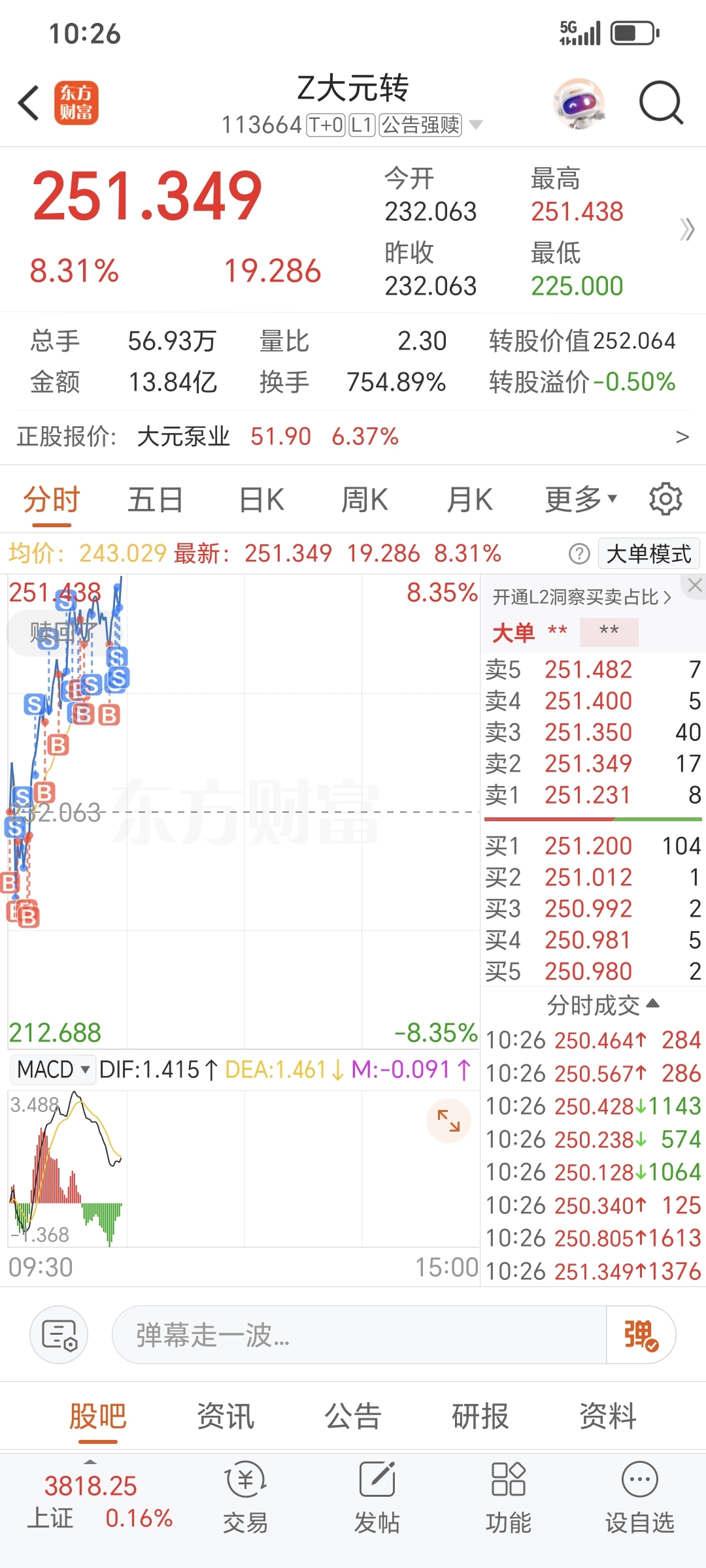 $Z大元转(SH113664)$ 做的愚蠢的是竞价入的,拉升没跑,226割了,让后229又进,很难受