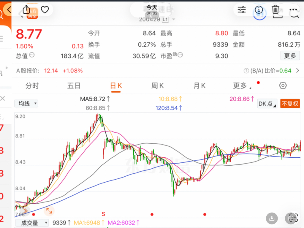 $粤高速B(SZ200429)$ 去年除息行情7.5涨到9.2元涨23%。今年同幅度从8.5估计上看10.4元而今年股息大增15%及去年银行降息修正上看11元及12港元也是可能的。时间于昨天机构正式开始进场了。息率7.6%二市B股最好的。50万亿三年期定存陆续到期,目前三年期1.5%股息,大量资金来粤高速B收取5倍利息公用事业股。3年复投23%股息
