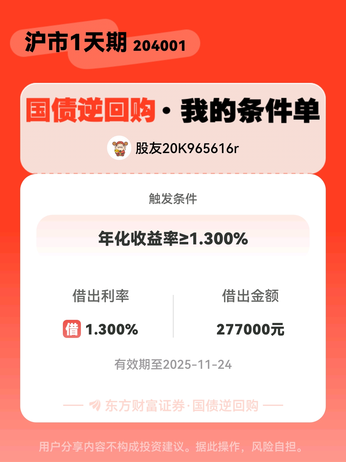 #条件单交流# #国债逆回购晒单# 一位股神设置了一个国债逆回购条件单,接下来就是见证奇迹的时刻~$GC001(SH204001)$