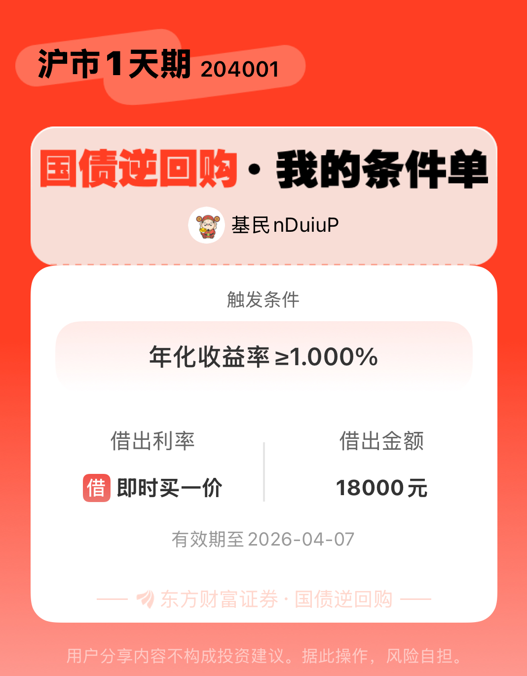 #条件单交流# #国债逆回购晒单# 一位股神设置了一个国债逆回购条件单,接下来就是见证奇迹的时刻~$GC001(SH204001)$