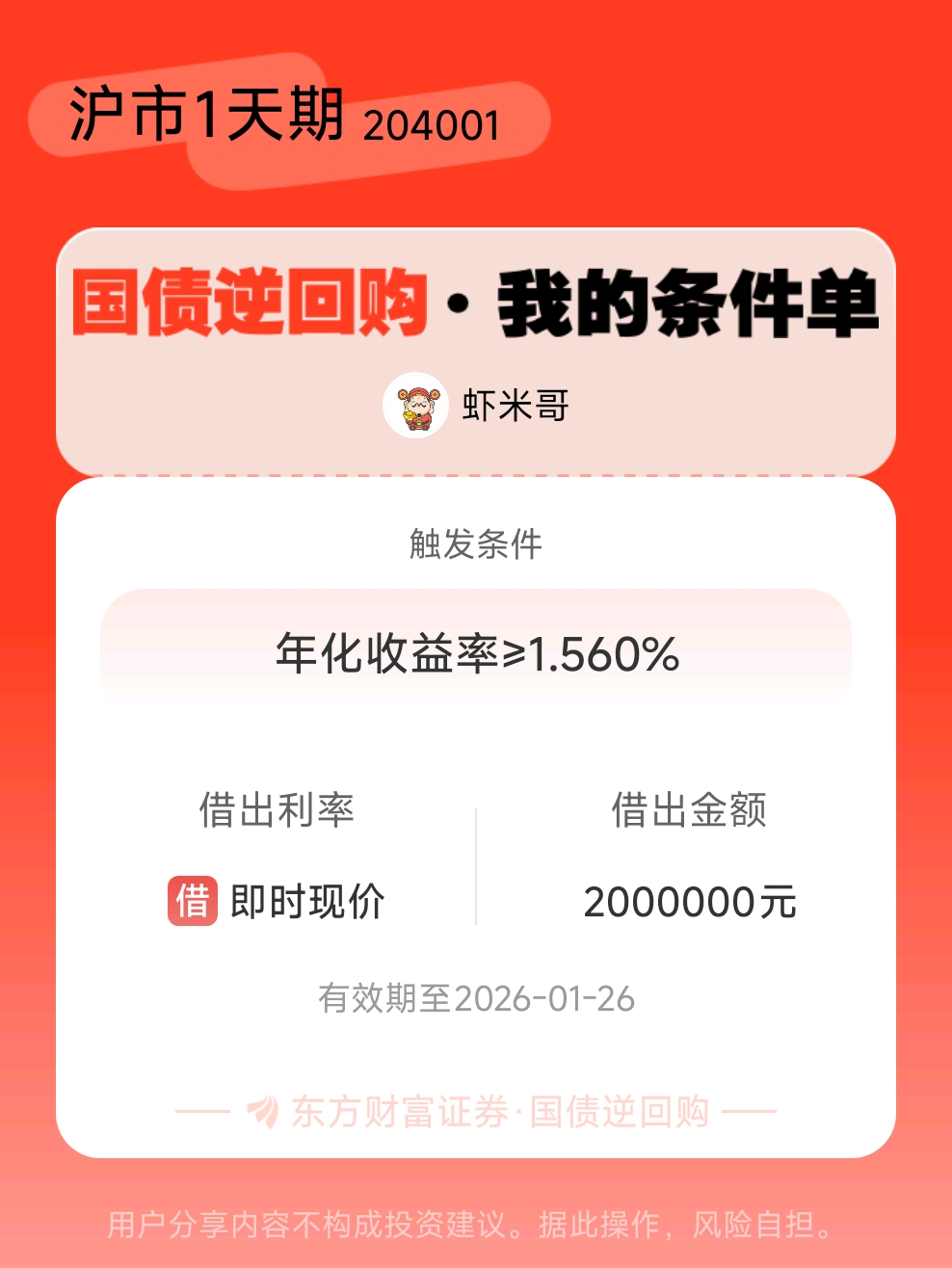 #条件单交流# #国债逆回购晒单# 一位股神设置了一个国债逆回购条件单,接下来就是见证奇迹的时刻~$GC001(SH204001)$