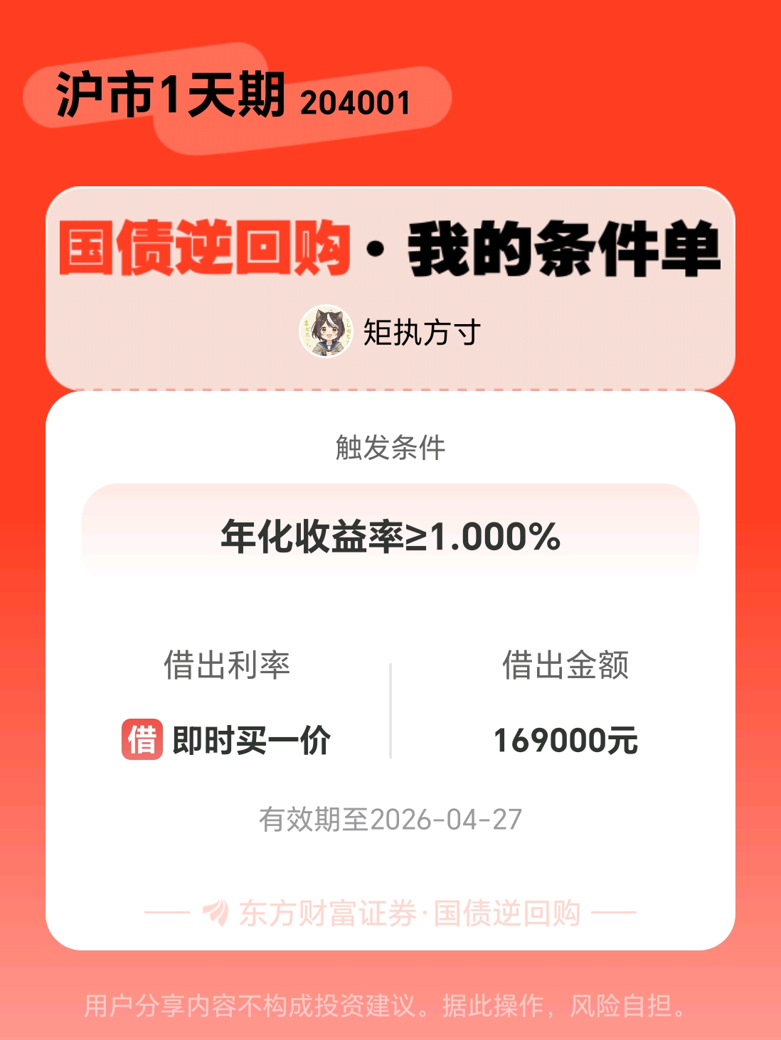 #条件单交流# #国债逆回购晒单# 一位股神设置了一个国债逆回购条件单,接下来就是见证奇迹的时刻~$GC001(SH204001)$