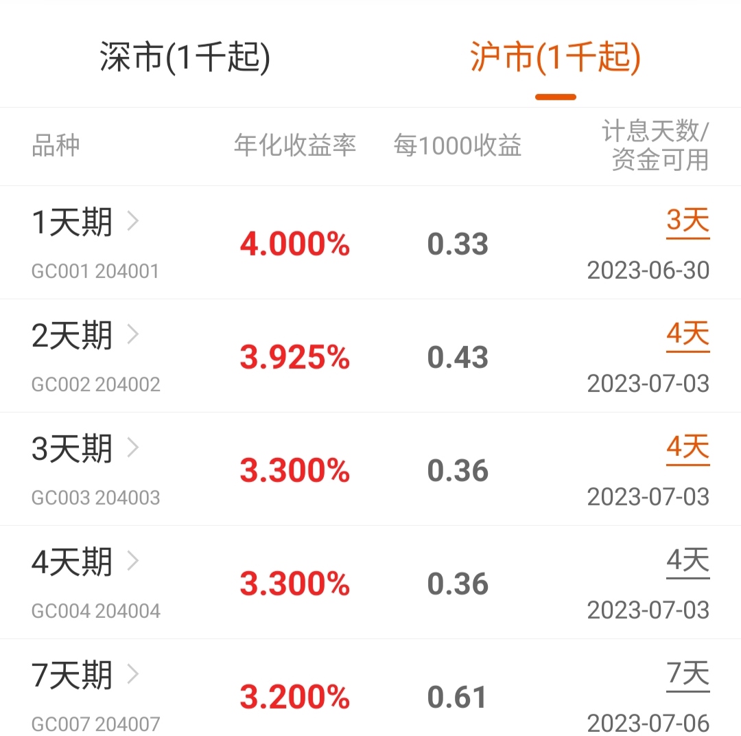 $GC002(SH204002)$ 目前观察连1天期国债逆回购的年化收益率,都已经涨到4.000%了。