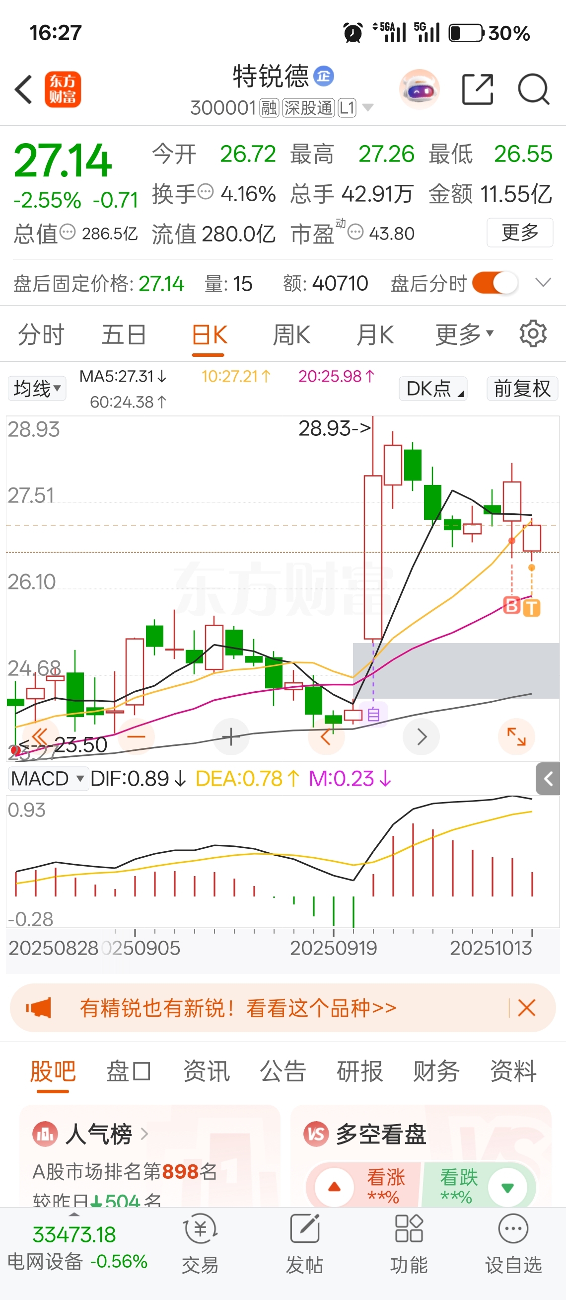 $特锐德(SZ300001)$ 今天做个t了20手,加仓了16手,有点慌居然没反包,明天看情况吧!再不拉上去要去20天线了,但是周线月线走的很漂亮,短期需要警惕回落