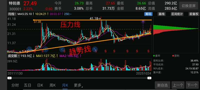 $特锐德(SZ300001)$ 上升趋势线+压力线,顶破压力线是牛市,跌破趋势线是熊市。